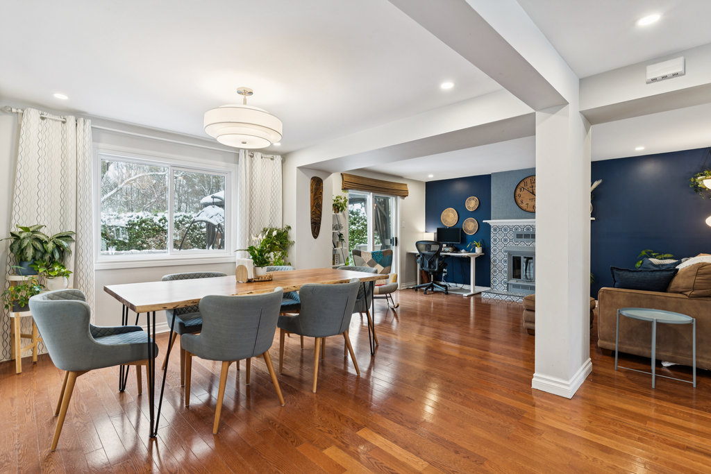 Family room with wood-burning fireplace, open to dining area