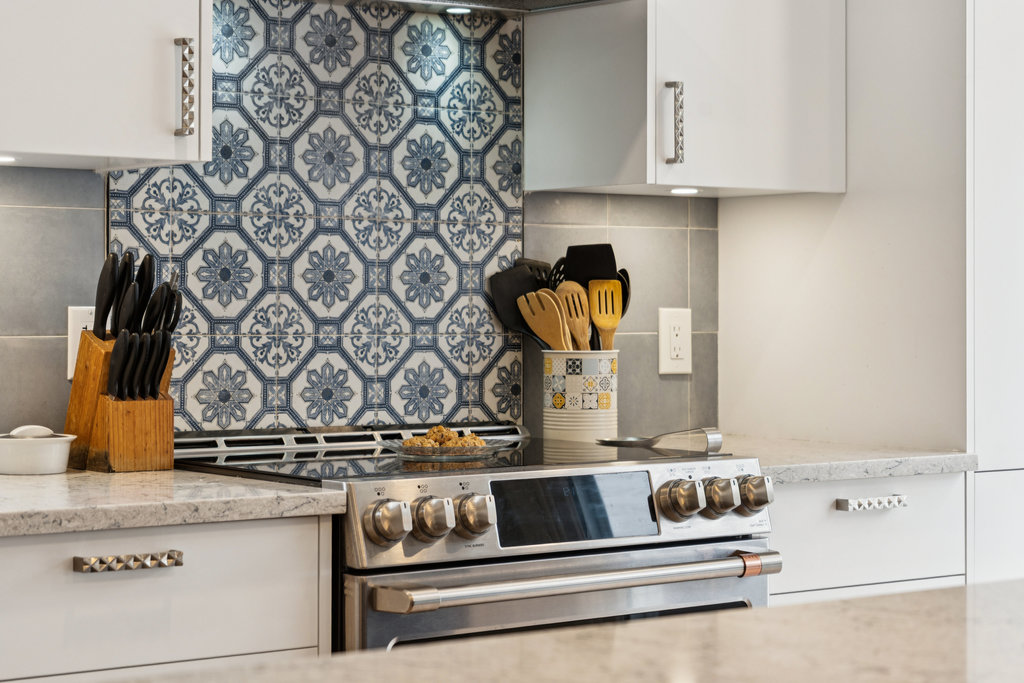 Modern kitchen with quartz countertops, sleek cabinetry, oversized fridge & double induction oven