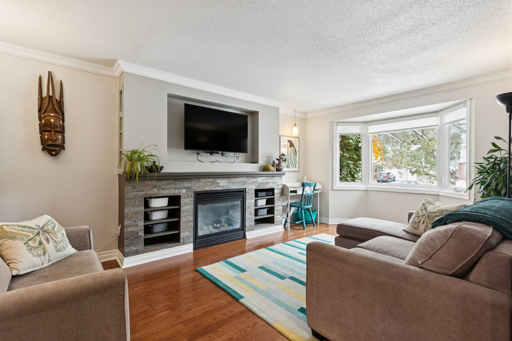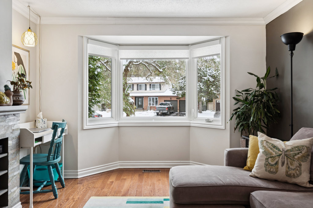 Bright living room with bay window and gas fireplace — perfect for quiet mornings or reading
