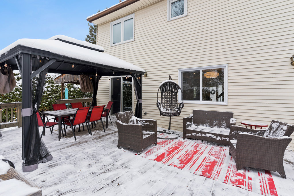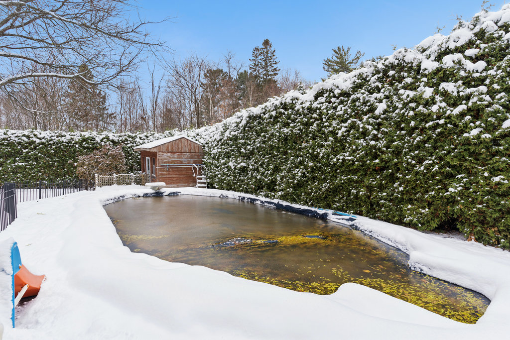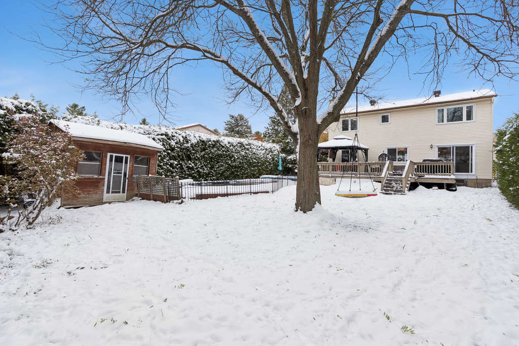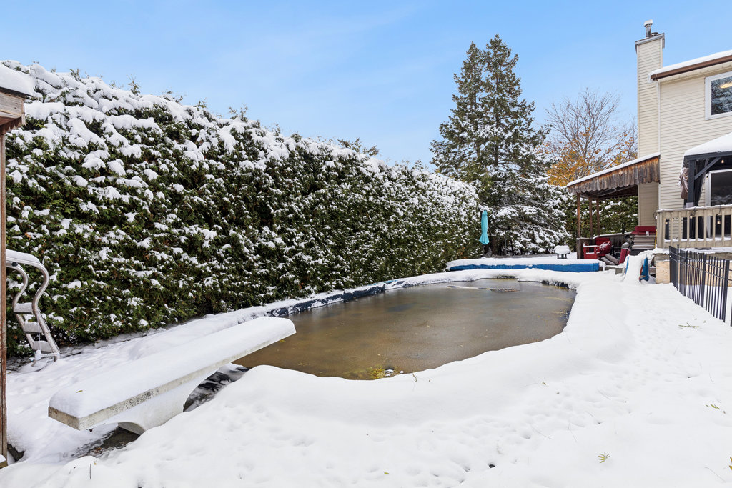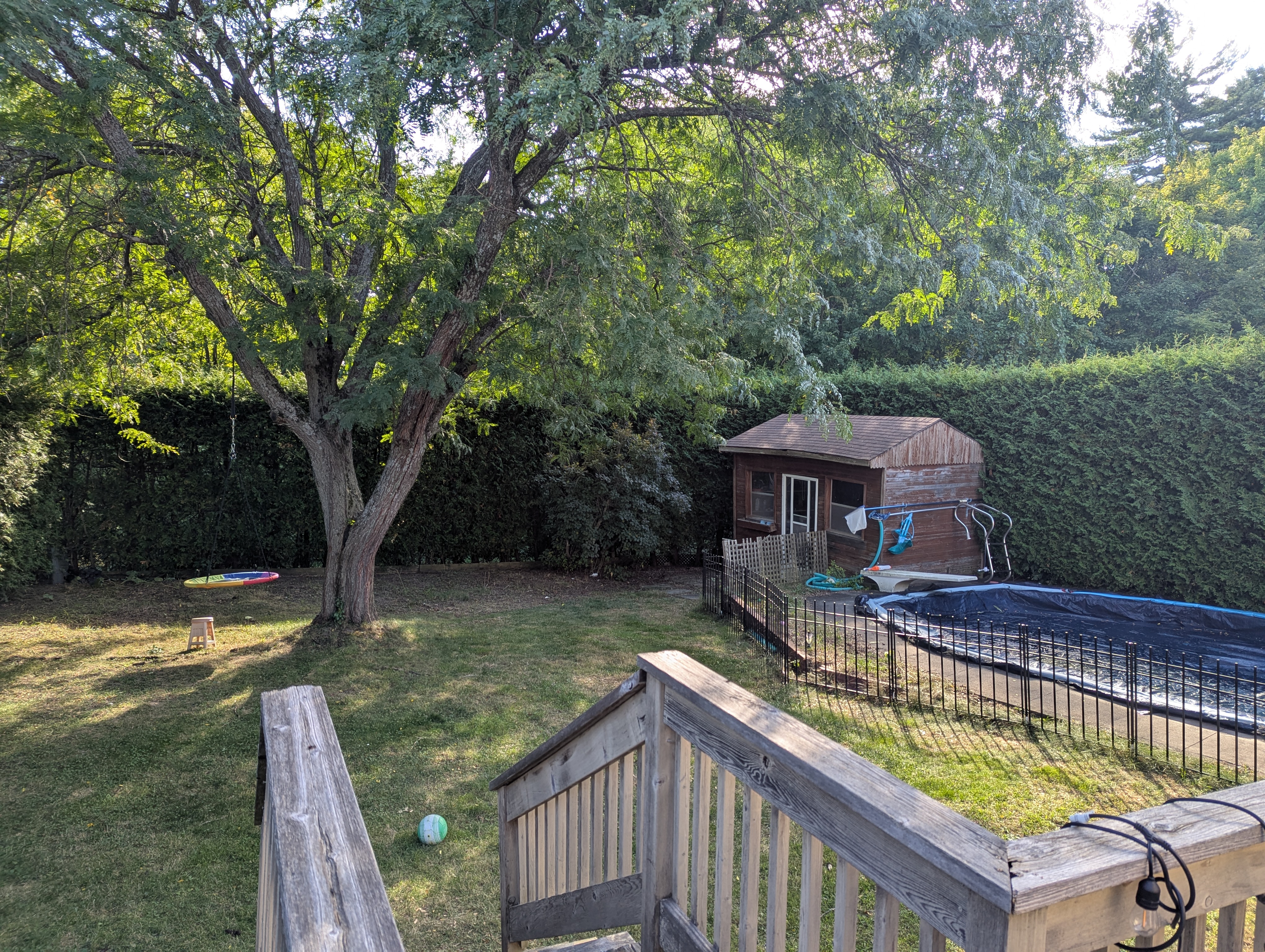 Private, fully fenced backyard oasis with an in-ground pool, large deck, and mature trees — ideal for relaxing or entertaining.