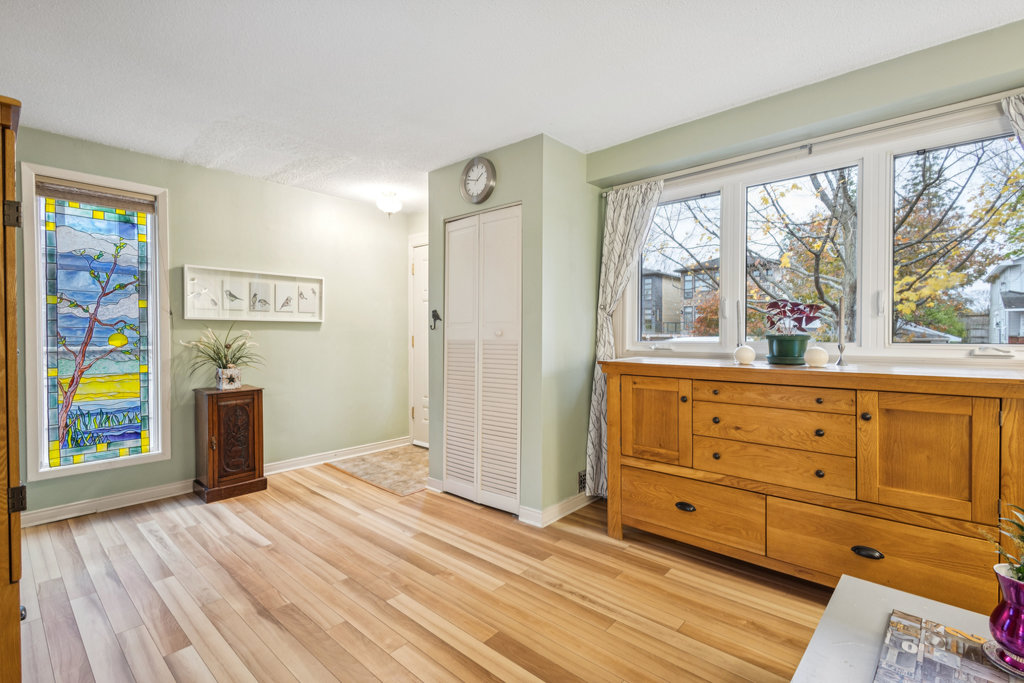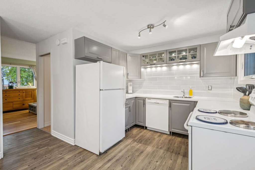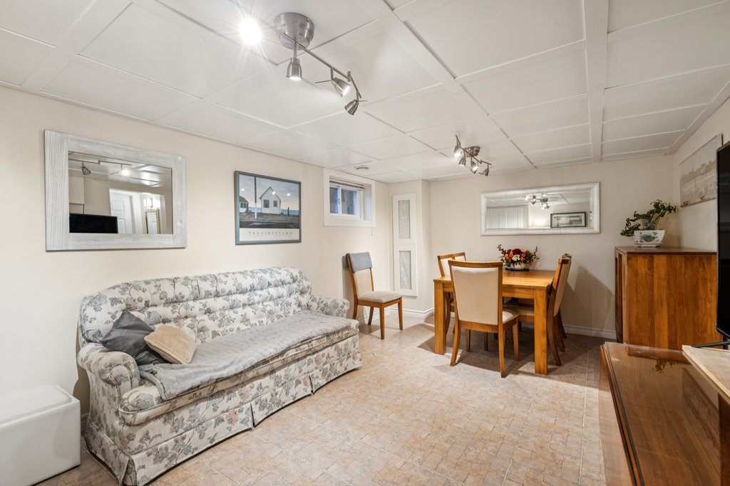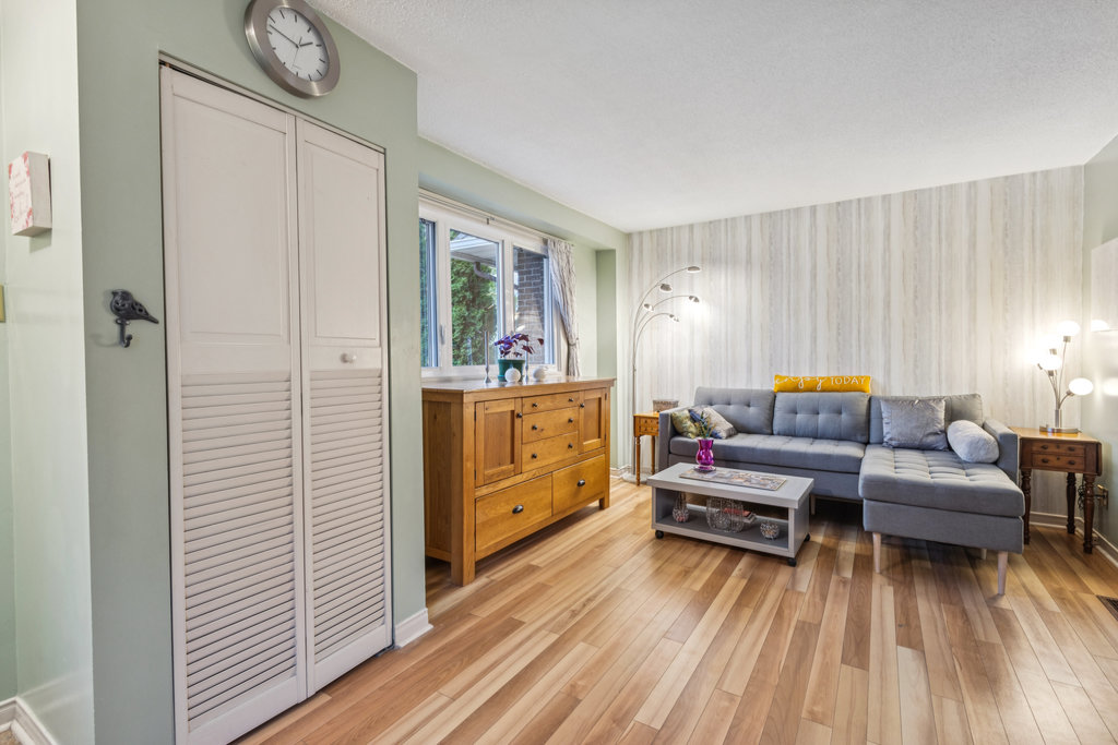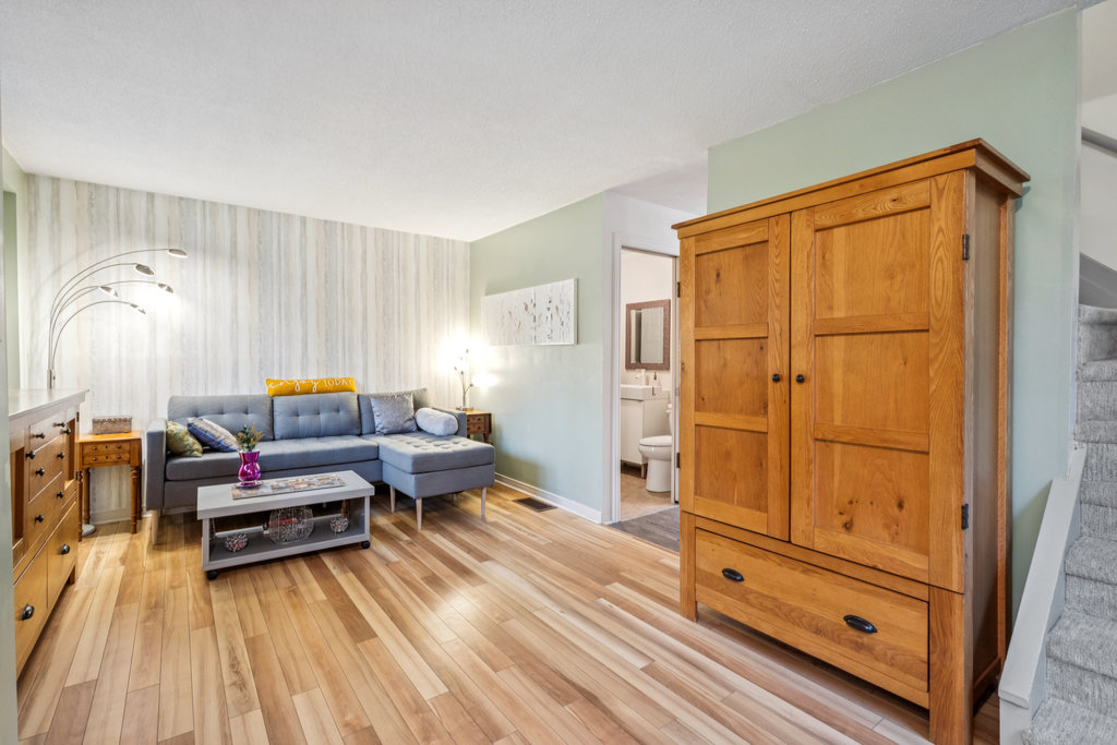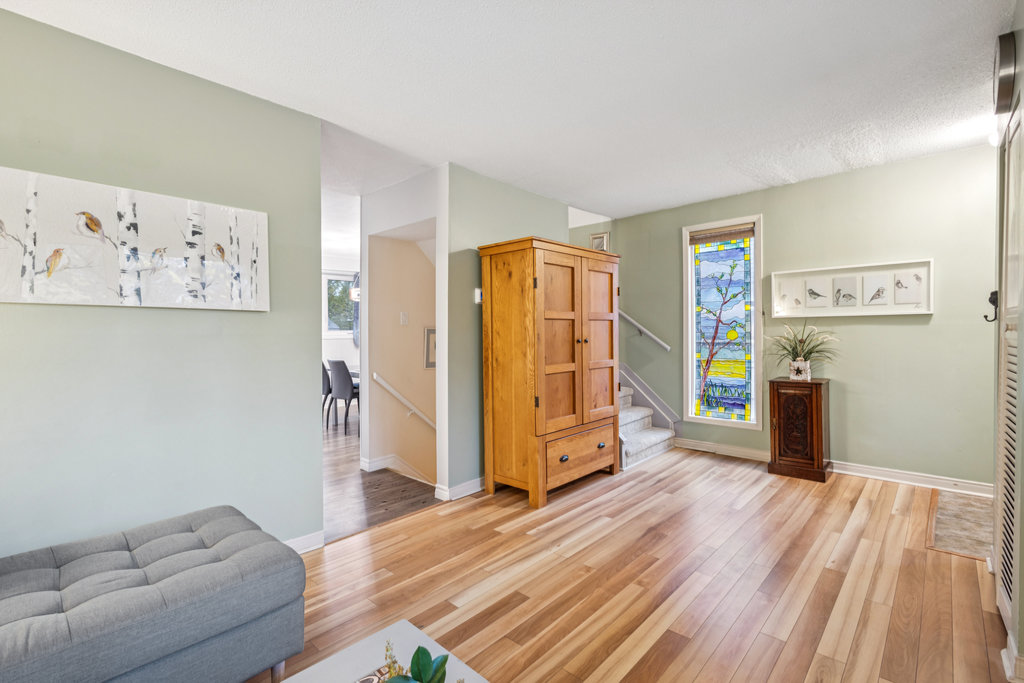 Bright and welcoming with a sun-filled living room, remodelled kitchen, dining area, and convenient powder room with laundry.